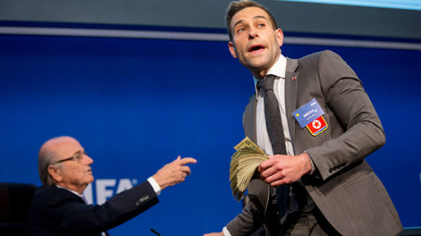 وكان برودكين قد فاجأ الحضور في مؤتمر صحفي ، عقده جوزيف بلاتر رئيس الفيفا أمس الاثنين بمقر الاتحاد في زيوريخ ، عندما أمطر بلاتر 79/ عاما/ بدولارات نزيفة.
