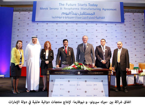 وقعت شركة "ميرك سيرونو" العالمية للصناعات الدوائية إحدى شركات مجموعة "ميرك كيه. جي. أيه. أيه" وشركة "نيوفارما" المحلية للصناعات الدوائية اتفاقية شراكة لانتاج الأدوية في دولة الإمارات و توزيعها في منطقة الشرق الأوسط .