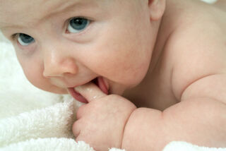 كما يضع الطفل إصبعه أو ربما قبضة يده كاملة في فمه ويعاني من قلة النوم، بالإضافة إلى التذمر والأنين.