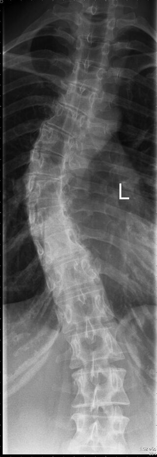 وتتمثل أعراض هذا التشوه العظمي في انحناء العمود الفقري واستدارة الفقرات، وفي بعض الأحيان يتخذ العمود الفقري شكل حرف S أو حرف C، بالإضافة إلى عدم استواء الكتفين وميل الحوض.