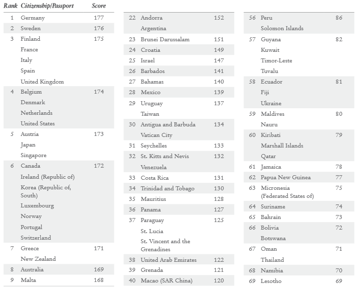 وقد تم الاعتماد في تصنيف الدول وفقاً لعدد الدول الأخرى التي يتمكن صاحب جواز السفر الحامل لجنسيتها من دخولها دون تأشيرة، وجاء جواز السفر الألماني في المقدمة حيث يستطيع صاحبه دخول 177 دولة دون تأشيرة.