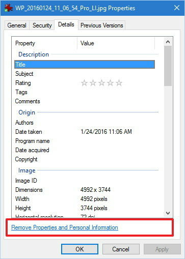 ويتمكن المستخدم من حذف هذه البيانات في بيئة عمل نظام تشغيل مايكروسوفت ويندوز بكل سهولة من خلال النقر على الزر الأيمن للفأرة، ثم تحديد الخيار "خصائص"، وبعد ذلك يتم تحديد المعلومات المعينة المراد حذفها، أو يمكنه النقر على بند "إزالة الخصائص والمعلومات الشخصية".