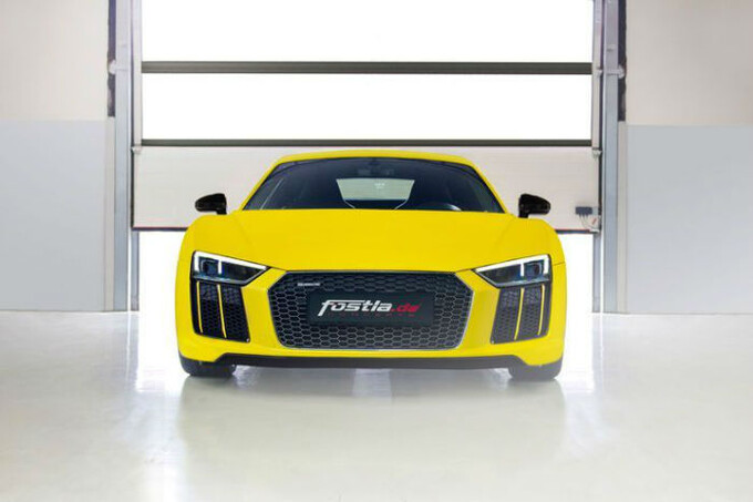 (د ب أ)- تقدم شركة التعديل الألمانية فوستلا لسيارات السباقات أودي R8 V10 plus ثوباً جذاباً عبارة عن رقاقات تكسو جسم السيارة تتلألأ باللون الأصفر ميتالك لزهرة دوار الشمس (Sunflower Matt Metallic).