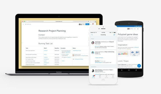 وبالإضافة إلى ذلك، فإن وظيفة Paper تدعم إمكانية دمج مقاطع الفيديو والجداول أو قوائم المهام أو حتى الملصقات من أجل التواصل مع المستخدمين الآخرين بعيداً عن المستندات.
