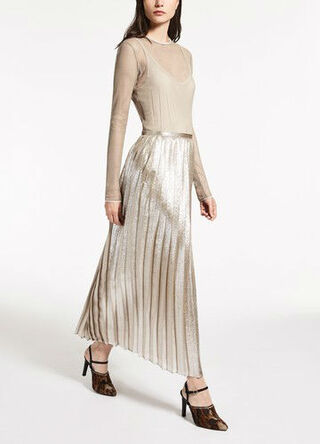 وأوضحت المجلة على موقعها على شبكة الإنترنت أن التنورة البليسيه ذات الطيّات تتألق هذا الموسم بالألوان الميتالك البرّاقة، مثل الفضي والنحاسي، مشيرة إلى أنه من الأفضل اختيار موديل ذي بريق خفيف للإطلالات النهارية، بينما يمكن اختيار موديل ذي لون ميتالك صارخ للإطلالات المسائية.