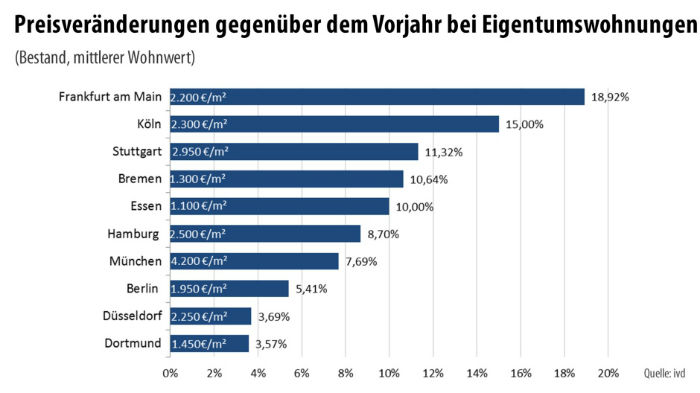 وقد احتلت مدينة فرانكفورت رأس قائمة المدن العشر الأولى التي شهدت أعلى نسبة زيادة في الأسعار. ففي عاصمة الماين ارتفعت أسعار الوحدات السكنية ذات القيمة المتوسطة بنحو 19 في المئة لتصل في المتوسط إلى 2200 يورو لكل متر مربع. في حين أن أعلى الأسعار توجد في مدينة ميونيخ. فهناك شهدت الأسعار أيضاً ارتفاعاً بحوالي 7,7 في المئة. وحالياً يبلغ متوسط سعر الوحدات السكنية ذات القيمة المتوسطة 4200 يورو لكل متر مربع.