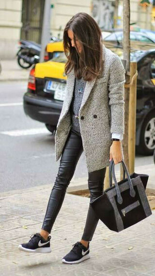 وكمثال على موضة "Athleisure Wear" يمكن تنسيق حذاء رياضي مع ليجنز جلدي أو سكيني ممزق وجاكت جلدي.