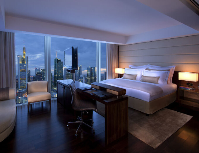 تتوزع غرف وأجنحة الفندق الفخمة الـ 217 بين الطابق 6 وحتى الطابق 25 من برج الفندق وتوفر إطلالات رائعة على أفق مدينة فرانكفورت. ويسود التصميم الراقي الحديث في داخل الفندق، حيث يتمتع التصميم الداخلي بظلال دافئة بنية اللون، كالجوز والعسل، مع مزيج من المواد الطبيعية ذات الجودة العالية مثل الحجر الطبيعي والزجاج والخشب والجلود والأقمشة الرفيعة، التي تخلق جواً لطيفاً في الغرف. ويتمتع العديد من الغرف بميزة الحمام المفتوح، الذي يضمن مساحة ذات رحابة استثنائية عبر الانتقال السلس من الحمام إلى غرفة المعيشة. ومن خلال التجهيزات الراقية للتحكم بالضوء، التقنيات الترفيهية وأجهزة تكييف الهواء تكتمل وسائل الراحة التقنية. ويوجد في جميع الغرف لوحة أصلية كبيرة الحجم من لوحات الفنان الألماني الشهير "هارتفيغ إلبرسباخ" (Hartwig Ebersbach). يبلغ متوسط مساحة غرف الديلوكس 35 متراً مربعاً. ومن بين الـ 49 جناحاً يوجد جناح سيناتور كبير بمساحة 105 متراً مربعاً والجناح الرئاسي في الطابق 24. ويمتد الأخير على مساحة تزيد عن 200 متر مربع ويحتوي على غرفتي نوم ومنطقة للعمل وساونا خاصة وإطلالة فريدة على فرانكفورت.