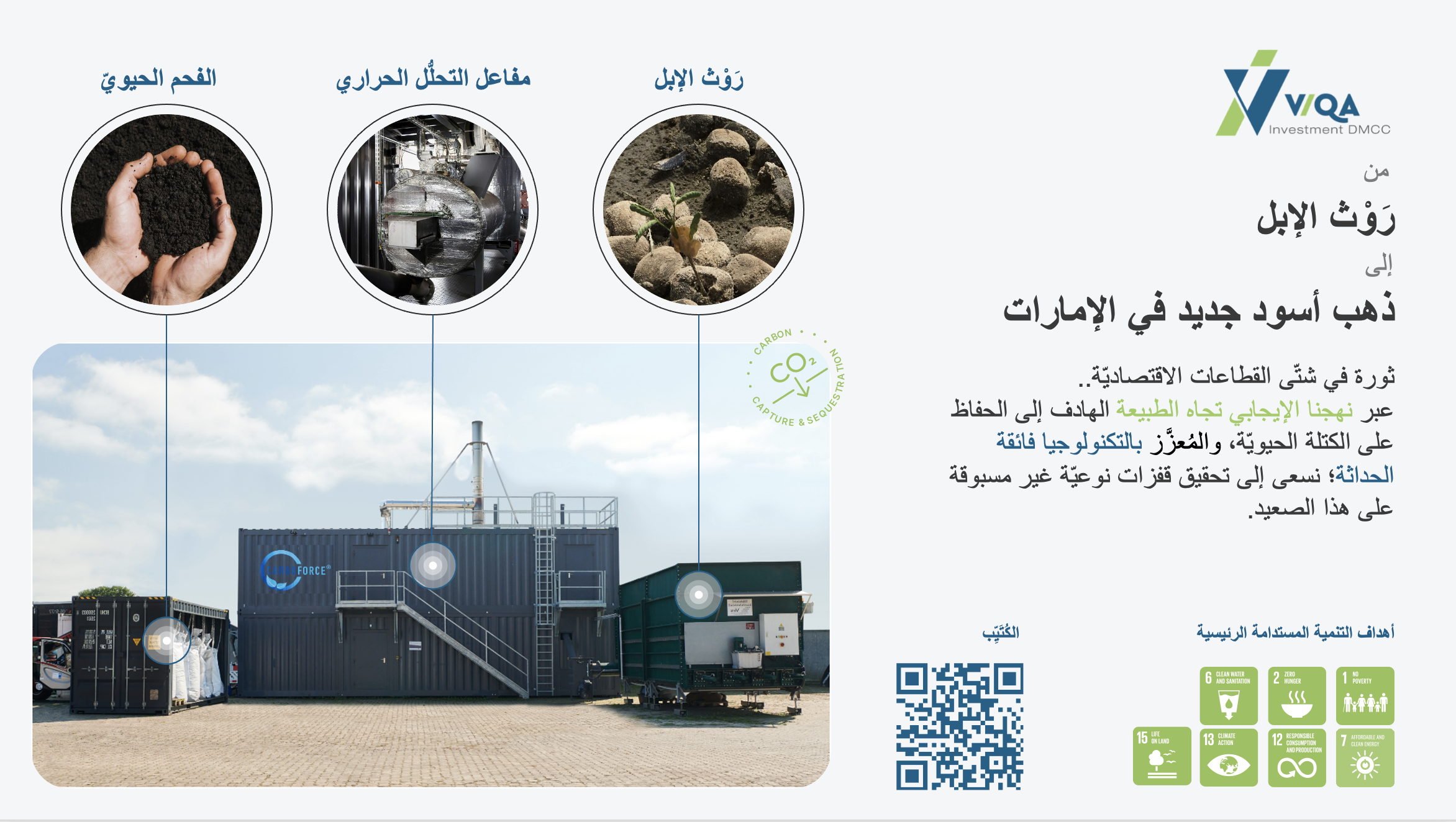 " لقد سخرنا التقنيات والعقلية الالمانية لابتكار هذه التكنولوجيا التي تشكل تطوراً هاماً بالنسبة للعالم العربي، حيث يمكنناتحويل أرض الصحراء القاحلة إلى أرض زراعية خضراء توفر الغذاء وتحقق الرخاء في دولة الامارات العربية المتحدة، كما أن الجمل قد أصبح مصدراً يسهم في تحقيق الخصوبة للأرض ". وأضاف فيكا:" تمتلك دولة الامارات العديد من الجمال التي تعتبر مصدراً هاماً في تحقيق الخصوبة للأرض، مما يجعل الجمال كنزاً حقيقياً في جهودنا، ونحن نسهم اليوم في ابتكار إماراتي عبر هذه التكنولوجيا التي ستلعب دوراً محورياً في الحفاظ على البيئة و تقليل الانبعاثات الكربونية بشكل كبير". وسيسهم استخدام هذا الابتكار الجديد إلى تخفيف الحاجة إلى مدافن النفايات، التي ينبعث منها غاز الميثان، و يساعد الطاقة المتجددة في شكل طاقة حرارية وكهربائية، لتحل محل الوقود الأحفوري في مزرعة الجمال، مما يرسي الأساس للقضاء على النفايات العضوية، وتقليل انبعاثات ثاني أكسيد الكربون، وإنتاج واستخدام الطاقة المتجددة، وتصنيع منتج الفحم الحيوي، الذي يغذي التربة الصحراوية ويزيد من قدرتها على الاحتفاظ بالمياه للزراعة العضوية في الصحراء، وسيمكّن هذا التحول الاستراتيجي الإمارات من تحقيق الاكتفاء الذاتي الزراعي، مما يقلل الحاجة إلى استيراد الخضروات. وبدوره، يسلط السيد مطشر عوض البدري الرئيس التنفيذي لمصنع الامارات لانتاج حليب الابل " كاميليشيس " الضوء على الطبيعة التحويلية لتعاونهم مع شركة فيكا للاستثمار بالقول: