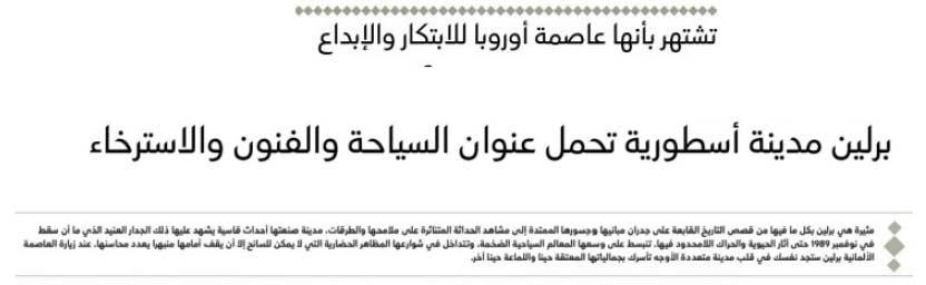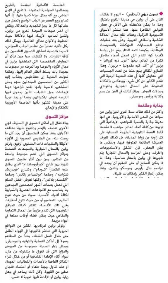 برلين مدينة أسطورية تحمل عنوان السياحة والفنون والاسترخاء برلين مدينة أسطورية تحمل عنوان السياحة والفنون والاسترخاء تحميل الملف (PDF) حظيت العاصمة برلين بتغطية جريدة (الاتحاد) في العدد الصادر يوم 12 يناير 2011 كمدينة جذابة بالنسبة للمواهب الإبداعية ومسايرة لروح العصر وزاخرة بالتنوع، حيث تضم معالم سياحية متفردة ومراكز تسوق تلبي كافة الأذواق ومساحات خضراء ساحرة. اقرأ أيضاً برلين.. عاصمة شباب العالم برلين صديقة العائلة والأطفال 48 ساعة فقط طلبك دائماً موجود السياحة في برلين: طلبك دائماً موجود جزيرة المتاحف في برلين فرادة العمارة والمقتنيات الأثرية 10 وصفات لصناعة مهرجان يملأ الدنيا ويشغل الناس نجوم ومشاهير تجري في عروقهم الدماء الألمانية المدن الألمانية أماكن سياحية خدمات ينصح بها تفاعل معنا آخر الأخبار “ACT” شركة تعلن عن أول عملية بيع لجناح الجراحة الروبوتية للعمود الفقري" في الكويت "نُسُك" تسعى لأتمتة إجراءات مناسك الحج والعمرة انجاز هام بالتعاون بين الامارات لإنتاج حليب الإبل وفيكا للاستثمار الألمانية فينترسال دِيا الألمانية تأمل في الاستثمار وتطوير المشاريع في منطقة الشرق الأوسط وشمال إفريقيا فينترسال دِيا الألمانية تأمل في الاستثمار وتطوير المشاريع في منطقة الشرق الأوسط وشمال إفريقيا فينترسال دِيا تبدأ بأولى عمليات تخزين للكربون في بحر الشمال الدنماركي كجزء من مشروع «غرين ساند» عرض كافة الموضوعات