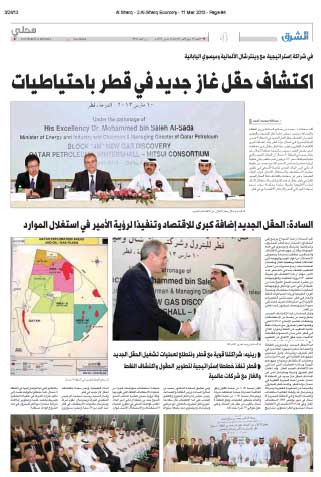 في عددها الصادر يوم 11 مارس 2013 سلطت صحيفة (الشرق) القطرية الضوء على خبر اكتشاف حقل غاز جديد في قطر بالتعاون بين شركة قطر للبترول وشركة فينترسهال الألمانية وشركة ميسوي اليابانية.