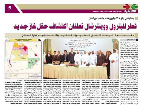 تضمنت صحيفة (الراية) القطرية في عددها الصادر يوم 11 مارس 2013 خبر اكتشاف حقل غاز جديد من قبل قطر للبترول وفينترسهال والمراحل التي مرت بها العمليات والأنشطة التي قامت بها الشركات في هذا الجانب وصولاً إلى اكتشاف الغاز في الحقل الجديد.