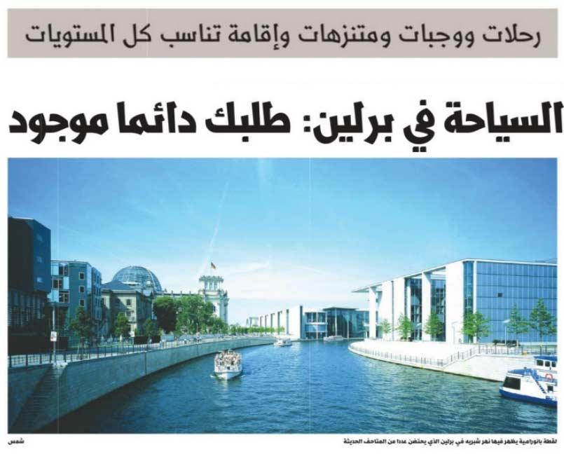 في العدد الصادر يوم 12 مارس 2011 تناولت صحيفة (شمس) العاصمة الألمانية برلين كوجهة عالمية مميزة للسياح القادمين من مختلف أنحاء العالم نظراً لما تتمتع به من جمال طبيعي، تنوع ثقافي، معالم أثرية، متاحف، وأماكن للترفيه تتناسب مع مختلف أفراد العائلة بالإضافة إلى أماكن الإقامة الراقية ومتاجر التسوق الفخمة.