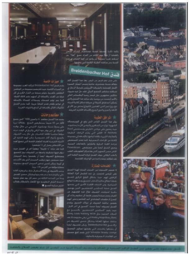 في عددها يوم 13 مايو 2010 تضمنت مجلة أهلاً التي تصدر في دولة الإمارات العربية المتحدة موضوعاً صحفياً حول السياحة والنقاهة في مدينة دوسلدورف. وأفردت المجلة مساحة لبعض من أبرز الأماكن التي تستحق الزيارة في المدينة، إلى جانب عدد من الفنادق والمرافق الطبية والمطاعم والحانات.