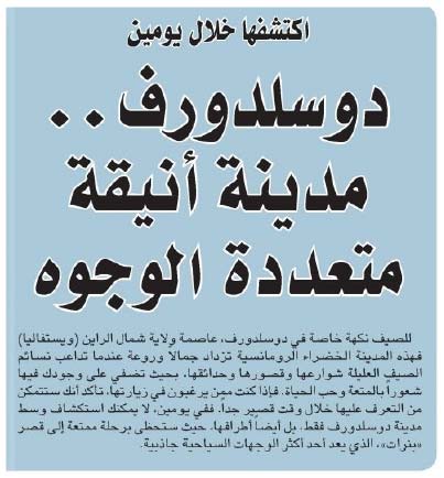 تناولت صحيفة الحرية في الكويت في عددها الصادر يوم 7 يونيو 2010 الوجوه المتعددة التي تتميز بها مدينة دوسلدورف وجاذبيتها كأحد أكثر الوجهات السياحية المعروفة وجمالها الخلاب لاسيما خلال فصل الصيف، حيث قدمت للقراء رحلة ممتعة تمكنهم في استكشاف وسط مدينة دوسلدورف وأطرافها خلال فترة قصيرة لا تتجاوز اليومين.