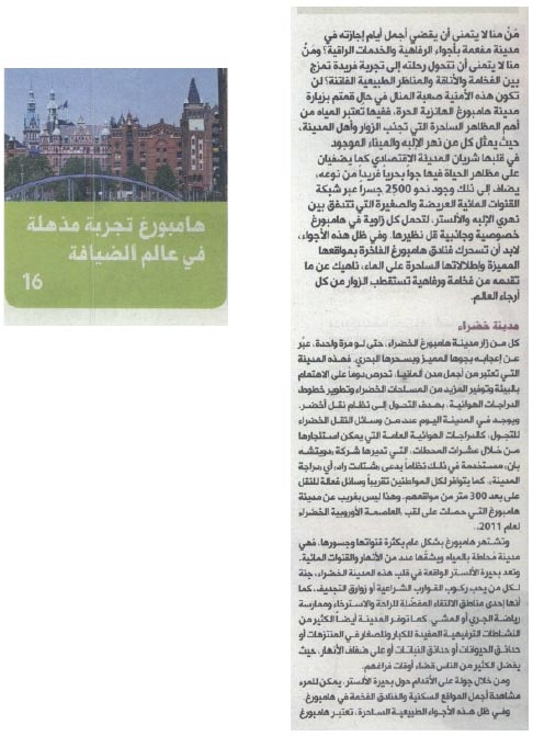 تناولت صحيفة (البيان) الإماراتية في عددها الصادر يوم 5 ديسمبر 2010 المزيج المذهل الذي تتميز به مدينة هامبورغ الحرة الهانزية، حيث سلطت الضوء على الفخامة الفندقية التي توفرها المدينة لزوارها والمساحات الطبيعية الخضراء التي تنتشر في أرجائها والعديد من نقاط الجذب السياحي الأخرى.