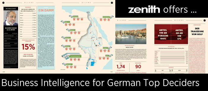 ومع شبكة عالمية من الكتاب، الصحفيين، المصورين تقدم زنيت كل شهرين تقارير حول الاقتصاد، السياسية والثقافة من عالم لا يزال يعتبر غريباً بالنسبة للكثير من الناس في أوروبا، إلا أنه يصبح أكثر قرباً يوماً بعد يوم. تقدم زنيت نظرة شاملة وكلية خلف الكواليس، ولذلك فهي لا تتمتع بسمعة ممتازة في ألمانيا فقط. فمنذ عام 1999 تتمتع زنيت بمركز ثابت في الصحافة الألمانية وتعتبر شريكاً مهماً لكبرى مؤسسات ودور النشر. ويتم عرض مقالات زنيت على الموقع الإلكتروني "شبيغل أونلاين" (Spiegel Online) بشكل منتظم. كما أن موضوعات زنيت الاقتصادية متوفرة للتنزيل المجاني لقراء الموقع الإلكتروني "شبيغل أونلاين". وبالإضافة إلى ذلك، يقوم محررو زنيت الاقتصاديون المختصون بتزويد مجلة "براند آينس" (brand eins) بتقارير حصرية. وإلى جانب التقارير والتحليلات حول السياسة والاقتصاد يقدم أيضاً مصورون حائزون على جوائز صوراً للمجلة لا تجعلها فقط مصدراً لا غنى عنه من المعلومات، بل تحولها إلى تجربة قراءة ممتعة، إذ تقترن زنيت لدى القراء بشكل أساسي بين ثلاثة خصائل رئيسية: الجودة الصحفية العالية، الاستقلالية، التقدير.