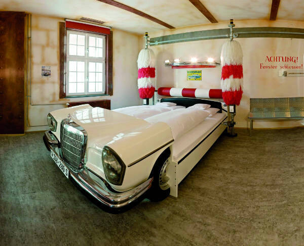 هل سبق لك المبيت في سيارة الخنفساء "فولكس فاغن كيفر"؟ إن ذلك ممكن في فندق (V8) في "مايلنفيرك شتوتغارت" في "بوبلينغن". فهذا الفندق الذي يتمتع بتصميم خاص يقدم غرف متنوعة ذات موضوعات تدور حول السيارات، من قبل دخولها إلى الورشة ووصولاً إلى عملية الغسل.