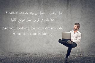 يعلن "Almaniah.com"، الموقع الإلكتروني الرائد المتخصص في الشأن الألماني، عن حاجته لصحفيين ومحررين بدوام كامل أو جزئي ممن يتقنون اللغات الألمانية، الإنكليزية والعربية وذلك تماشياً مع رؤيته وخططه المستقبلية والتي تضمن تغطية آخر الأحداث والمستجدات في ألمانيا وتقديمها للعالم العربي بلغته الأم.