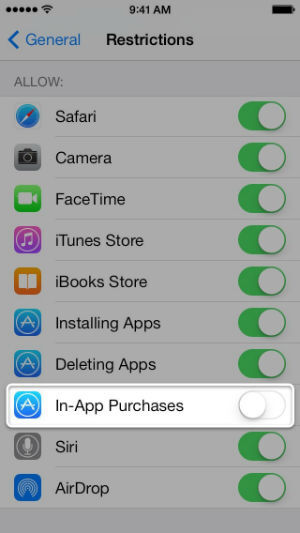 وبدلاً من ذلك يمكن للمستخدم حظر وظيفة المشتريات داخل التطبيقات؛ حيث يمكن العثور على هذه الوظيفة في الأجهزة الجوالة المزودة بنظام آبل آي أو إس في قائمة الإعدادات تحت بند "القيود" (Restrictions).