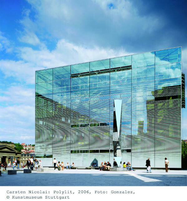 وفي الجهة المقابلة لساحة القصر الجميلة "شلوس بلاتس"، يتواجد متحف الفن "كونست موزيوم شتوتغارت" بمبناه الزجاجي المثير، والذي يمتلك فنوناً معاصرة فضلاً عن مطعم "كوبه" الممتاز في الجزء العلوي منه، مع إطلالات على المدينة بأكملها. ويتميز متحف الفن "كونست موزيوم" بمبناه المشيّد على شكل مكعب زجاجي متباهياً بسحره ليلاً، إذ تنعكس أضوائه على ساحة "شلوس بلاتس" وشارع الملك "كونغيسشتراسه" الذي يمثل بدوره مكاناً رائعاً للتنزه والتسوق. وتشمل معروضات هذا المتحف معروضات من القرن الثامن عشر وحتى الوقت الحاضر، ومن الانطباعية الشفابية وحتى الفن المعاصر.