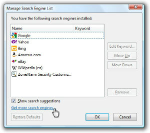 وكي يتمكن المستخدم من إضافة محركات بحث أخرى، يتعين عليه استدعاء قائمة إدارة محركات البحث "Manage Search Engine List" في قائمة محركات البحث، ويقوم بالنقر على بند إضافة محركات بحث أخرى "Get more search engines" في النافذة التي تنفتح بعد ذلك.