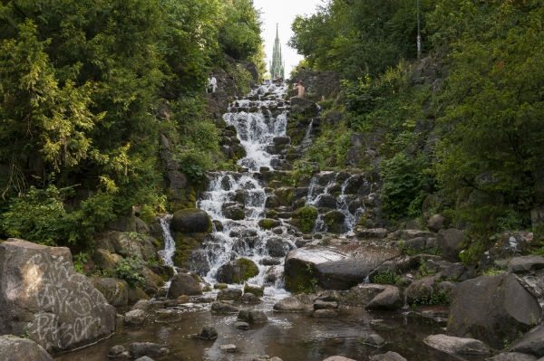 عند أقدام هذا النصب التذكاري الوطني يبرز شلال اصطناعي بشكل لافت ليهوي إلى أسفل التل عن التقاء شارع "غروسبيرين شتراسه" وشارع "كرويتسبيرغر شتراسه". وفي اللهجة العامية يُشار إلى الحديقة عادة بأنها "كرويتسبيرغ". ويمثل هذا الشلال الاصطناعي الذي يبلغ علوه 24 متراً نسخة مصغرة عن شلالات "هاينفال" في سلسلة الجبال العملاقة التي كانت تمثل سابقاً مقصداً سياحياً شهيراً لأثرياء برلين. وبناء على دراسات جيولوجية فقد تم تشكيل الصخور بشكل طبيعي للغاية. تضخ المياه اليوم 13 ألف لتر في الدقيقة. وفي الصيف يقوم العديد من سكان برلين بزيارة الحديقة وخصوصاً في فترة المساء من أجل التمتع بمشاهدة منظر غروب الشمس.