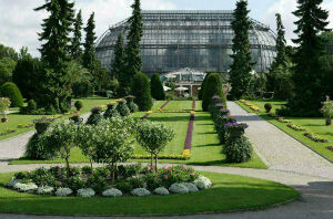 وعلى الطرف الشرقي من المتنزه، يتواجد 15 من البيوت الدفيئة (البيوت الزجاجية) في أنماط هندسية، من بينهما البيت الاستوائي الكبير، الذي يعد واحداً من أكبر البيوت في هذا المجال ومثالاً واضحاً على العمارة الزجاجية الفولاذية للقرن التاسع عشر. أما المتحف النباتي، الذي يعد الوحيد من نوعه على المستوى الأوروبي، فيشتمل على مجموعات نباتية علمية واسعة ومتحف للعرض، حيث يمكن هنا دراسة الملحقات النباتية لمقابر الفراعنة المصريين جنباً إلى جنب مع نماذج عديدة من المملكة النباتية.