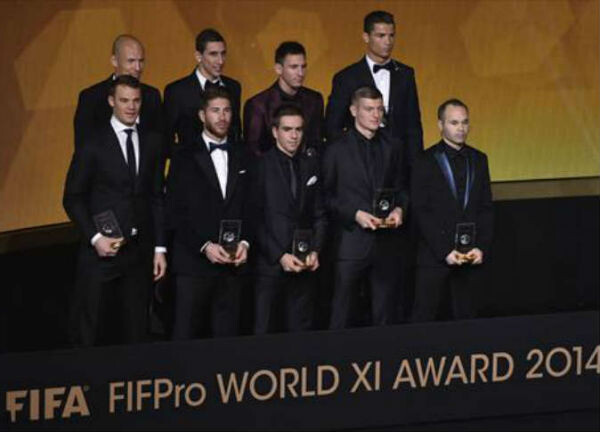 زيوريخ (د ب أ)- أعلن الاتحادان الدولي لكرة القدم (فيفا) والدولي للاعبي كرة القدم المحترفين (فيفبرو) امس الاثنين 12 يناير 2015 عن منتخب العالم لعام 2014 وذلك في الحفل السنوي لتوزيع جوائز الفيفا.وضمت القائمة ثلاثة لاعبين من المنتخب الألماني ، الفائز بلقب كأس العالم 2014 بالبرازيل ولاعب واحد من ريال مدريد كما ضمت لاعبين فقط من المنتخب البرازيلي. ومثلهما من المنتخب الأرجنتيني.
