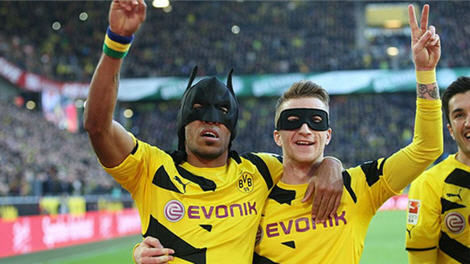 وانطلق المهاجم الجابوني بعد إحرازه للهدف الذي قاد دورتموند لتحقيق الفوز الأغلى له هذا الموسم إلى البحث عن الأقنعة التي كان يخفيها داخل المرمى وقام بعد ذلك بارتداء قناع باتمان وأعطى لزميله ريوس قناع روبين.