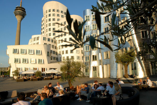 وتحت ظلال برج القصر القديم "شلوس تورم" يمكن للمرء أن يحظى بمشاهدة مناظر رائعة لنهر الراين ومنطقة "أوبركاسل" وميناء الإعلام "ميدين هافن"، حيث يعتبر الأخير بكل تأكيد من أبرز معالم المشهد المعماري في دوسلدورف. فبينما كان في السابق مكاناً محورياً للتجارة والصناعة، فهو اليوم يبهر خبراء العمارة الدوليين برموزه التقليدية والحديثة. وتعتبر مباني جيري المائلة "جيري باوتن"، التي صممها المهندس "فرانك جيري" من أشهر المباني التي يمكن أن ننسب سحرها الخاص إلى ميناء الإعلام، يضاف إلى ذلك الكثير من الجواهر المعمارية.