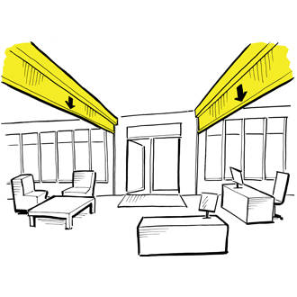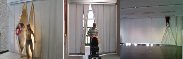بالنسبة للستائر غير المرئية التي تحمي من الحريق، فإن المرء لا يراها، لأنها تعتبر جزءاً من الهندسة المعمارية وتكون مخفية خلف الجدران أو في الأسقف. في حالة نشوب حريق تعمل الستائر بشكل تلقائي وتسد اللهب والدخان عن السلالم (1)، وتحافط على طرق الهرب خالية من الدخان (2) أو تقسم غرف كبيرة إلى عدة مناطق فردية للحماية (3).