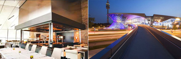 ومن الواضح أن الابتكار الفريد للمكتب الهندسي "كووب هيميلب" (COOP HIMMELB) يتضمن في الداخل أيضاً ما يعد به من الخارج. فإلى جانب تجربة خاصة جداً لتسليم السيارات وإضافة إلى الانطباع المعماري المتفرد، يحظى الزوار في "عالم بي إم دبليو" بأطايب الطعام: إذ يتمثل شعار مطعم "كلوب" الواقع في الطابق الثالث من "عالم بي إم دبليو" في: "دهشة. طعام. استمتاع".