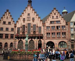 يحيط بميدان (رومربيرغ) مبان ذات طراز تقليدي قديم، كما يوجد في وسط هذا الميدان نبع العدالة (غيريشتيشكايتسبرونن) الذي كان يمثل قديماً المكان المفضل لأهالي مدينة فرانكفورت للاحتفال بتتويج القياصرة. ويُطلق اليوم على كامل مبنى البلدية اسم (مبنى رومر)، ويقع فيه مقر البلدية منذ العام 1405، كما إنه يتوسط المباني الثلاثة التي تم تصميم واجهاتها على شكل أدراج. ويوجد في مبنى (رومر) صالة القيصر (كايزر سال). ففي السابق، كانت صالة الإمبراطور مكاناً ملكياً يلائم تتويج الأباطرة الألمان وأصحاب الوظائف المدينة التي لا حصر لها. واليوم تصطف على جدرانها صور من القرن التاسع عشر لحوالي 52 امبراطوراً ألمانياً، ابتداءً بـ (شارلمان)، الذي توج سنة 800، وانتهاء بـ (فرانتس الثاني)، الذي تنازل عن العرش عام 1806. وقد تم إعادة بنائها بأسلوب عصري تماماً.