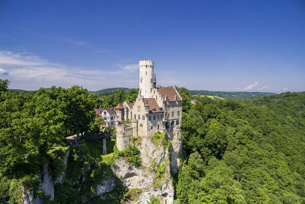كما يبرز قصر ليشتنشتاين كأسطورة أخرى من عالم القصور الأسطورية في القرن التاسع عشر. هذا القصر الجاثم فوق صخرة على ارتفاع 817 متراً، يمنح زواره مناظر خلابة تحبس الأنفاس، بحيث تكاد ترى (رابونتسل "وهي قصة أسطورية ألمانية للأخوين غريم بطلتها فتاة ذات شعر طويل جداً") تدلي شعرها من نافذة في الأعلى.