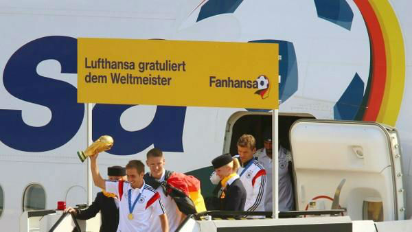 برلين 15 تموز/يوليو 2014 - عاد المنتخب الألماني المتوج بلقب بطولة كأس العالم لكرة القدم إلى بلاده اليوم الثلاثاء ليلقى استقبال الأبطال من مئات آلاف الجماهير الألمانية الذين احتشدوا حول بوابة "براندنبورج جيت" في برلين ووصل المنتخب الألماني مطار "تيجيل" متأخرا بنحو ساعة عن موعد وصوله الأصلي بسبب تأخر إقلاع الطائرة التابعة لشركة "لوفتهانزا" من ريو دي جانيرو.