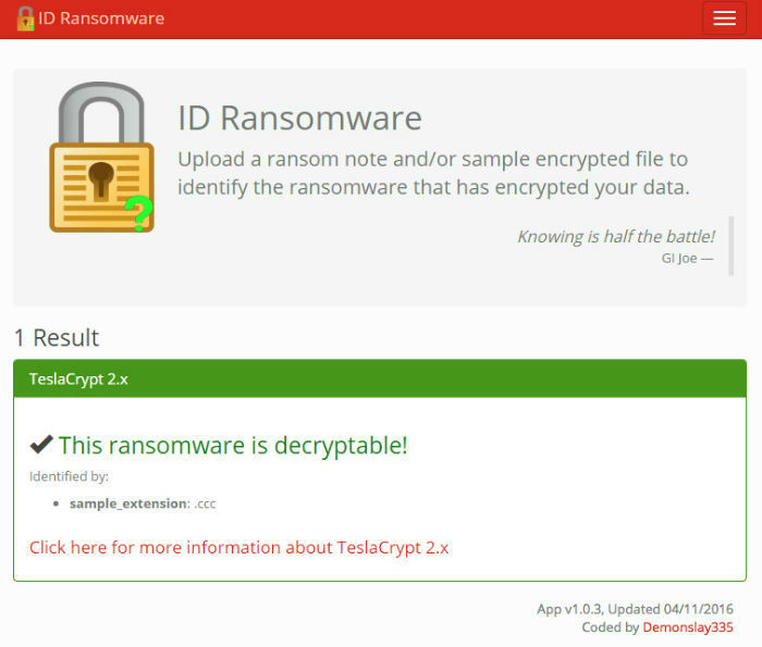 والبرامج، التي تساعد على فك تشفير البيانات. ويمكن للمستخدم اللجوء إلى موقع ID Ransomware لمعرفة نوعية