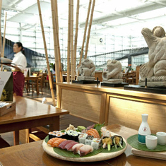 وضمن صالة إجراءت الدخول الصاخبة هناك مكان خاص جداً يرحب بالضيوف من خلال طوابقه المكونة من خشب الساج الأصلي والفن الآسيوي المميز، ويتمثل ذلك في مطعم (مانفوستين) (Mangostin)، الذي يتواجد في منطقة عامة من مبنى الركاب 2، ويعد واحداً من أكثر المطاعم التي تلقى إقبالاً بعد المطاعم الآسيوية. ويقدم المطعم الأطباق التايلاندية والسوشي. وهناك مطعم آسيوي آخر يقع في مبنى الركاب 1 ويتميز بسمعة كبيرة وهو مطعم (بامي) (Bamee)، الذي يتميز بأطباق السوشي الطازجة التي يقوم بإعدادها كبير الطهاة. ويتم إعداد جميع الأطباق في المطبخ المكشوف باستخدام وصفات تايلاندية أصلية.
